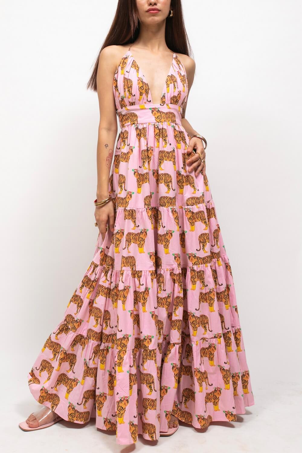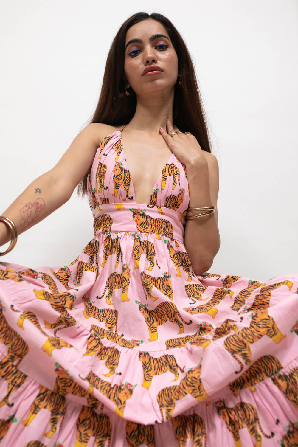 Introducing our stunning Baiana dress in this mesmerizing tiger block print. Crafted in 100% cotton and elegantly adorned with intricate Frida-inspired patterns, this dress exudes charm and sophistication. Authentic, organic, and oh-so-comfortable, our Frida block print dress is a wardrobe essential for any fashion enthusiast. What sets it apart? It's all about the fit! With tie-ups at the waist and neckline, you can adjust it to perfection, creating a flattering silhouette that accentuates your bust without the need for a bra. It's like a bikini effect, but even better!