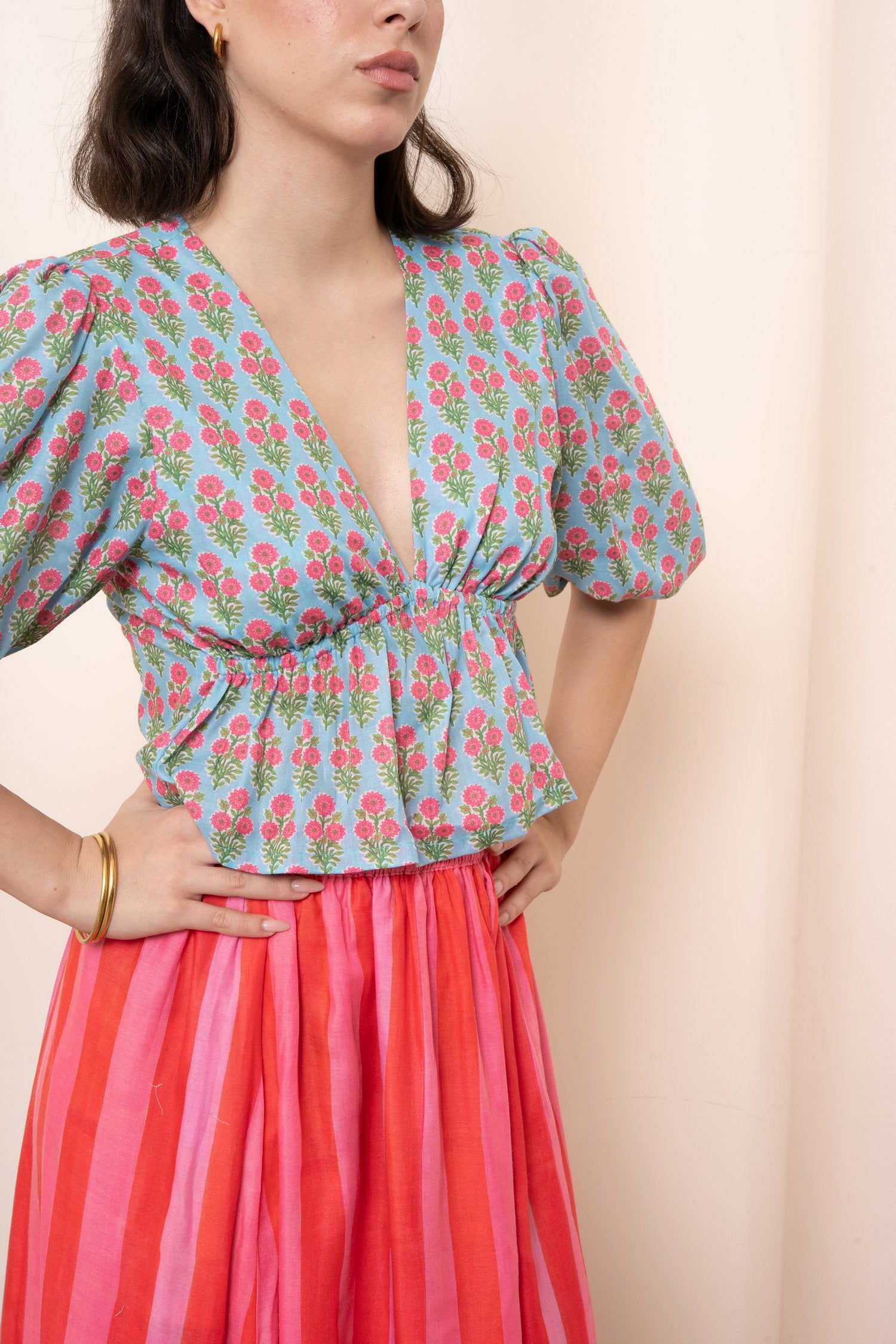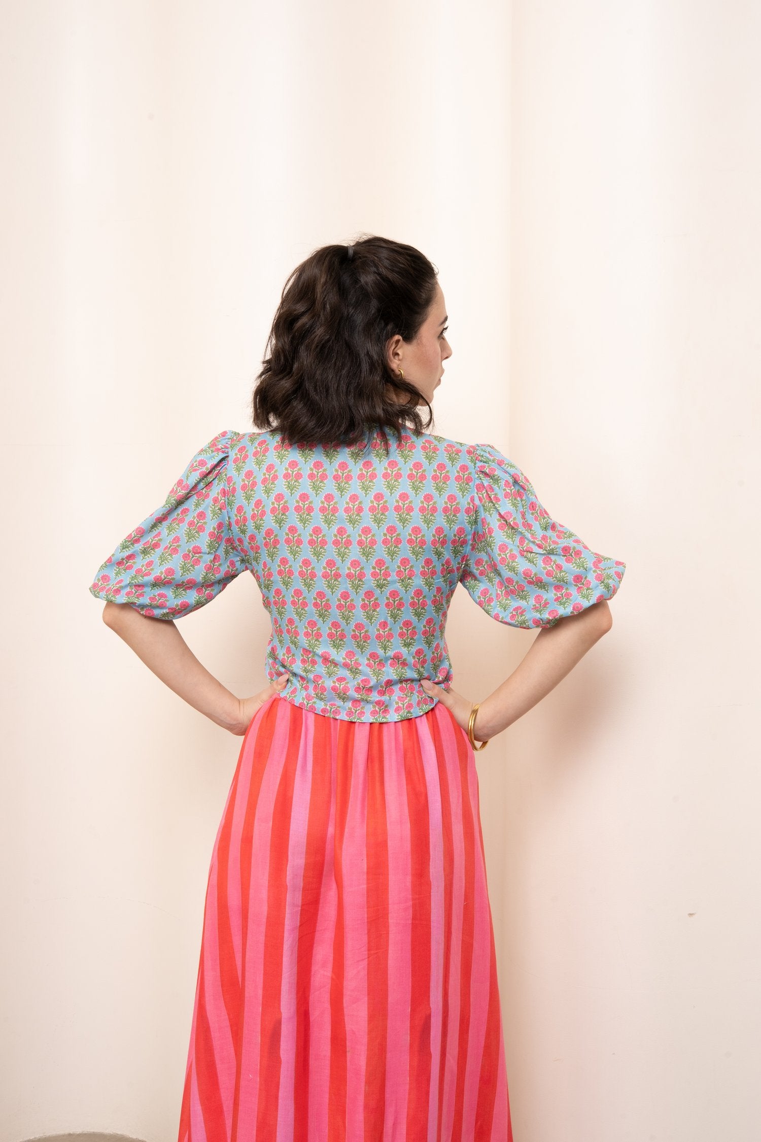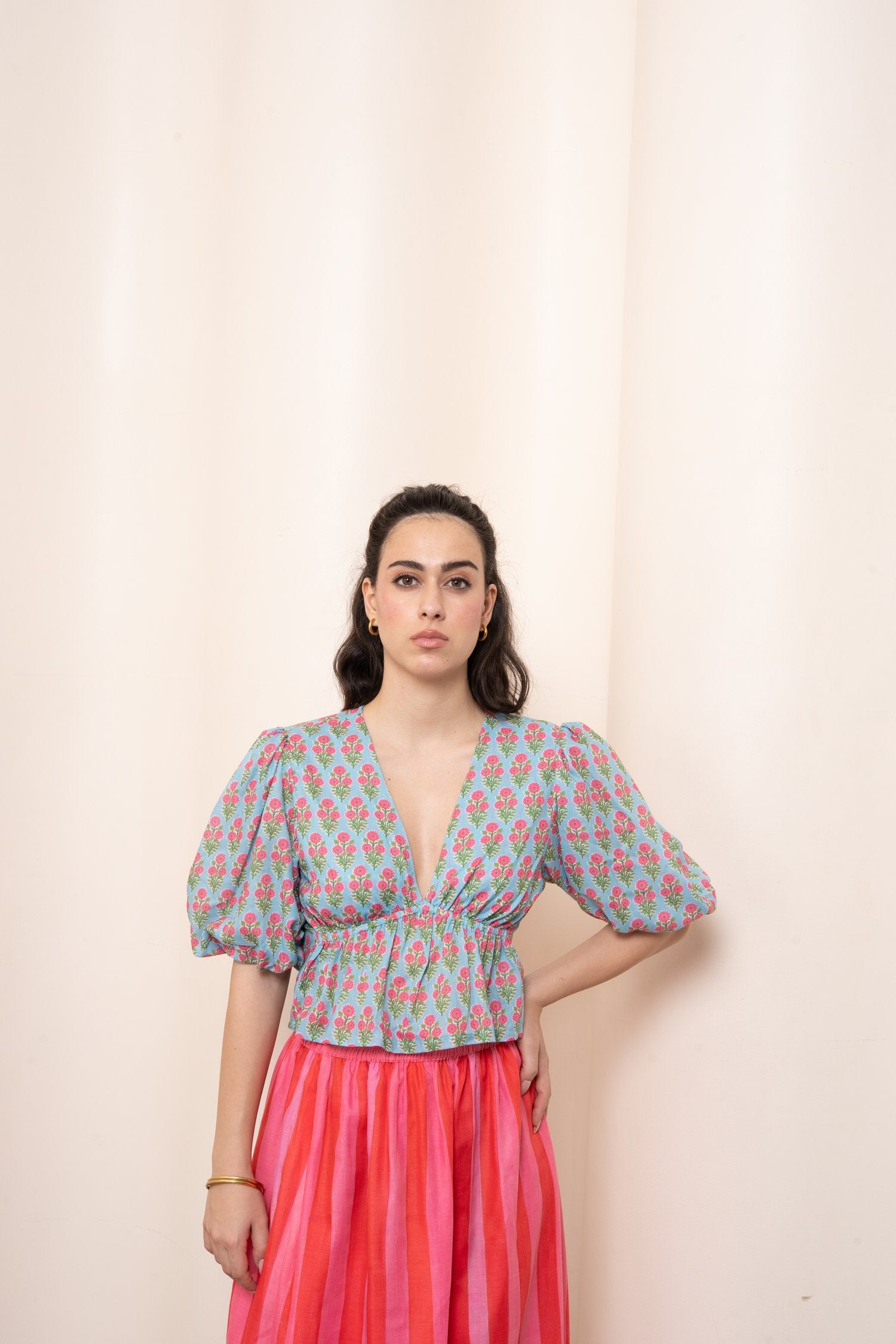 The Amy Top in Blue Motif is made from organic cotton linen blend fabric sourced from South India, tailored carefully at our Mumbai workshop by Saddam and our in-house artisans. Each piece is crafted in small batches with ethical pay and attention to detail.