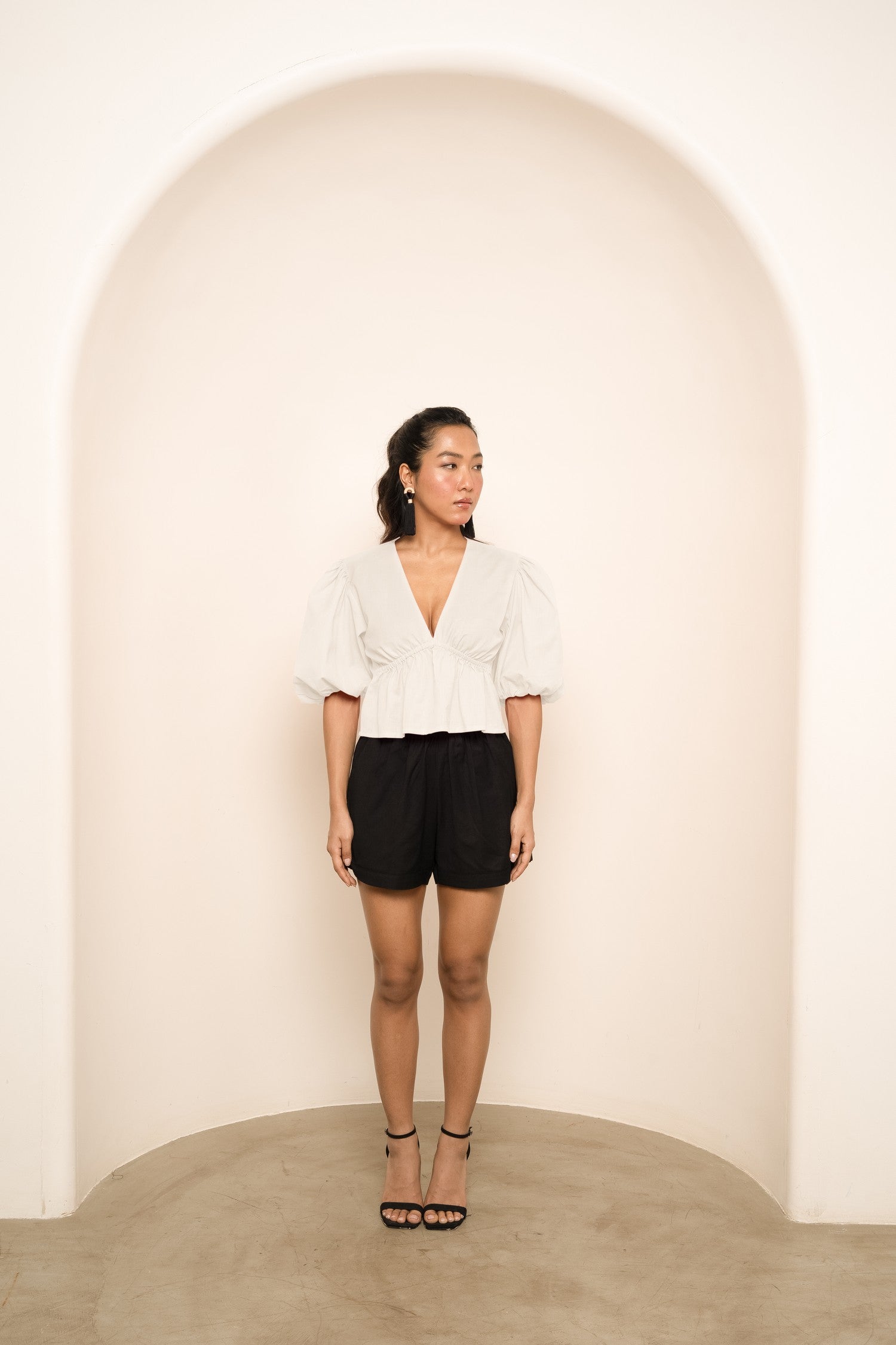 The Amy in coconut white is that rare mix of soft and strong. Pure ease with a little edge. The plunging neckline and underbust hold shape the body naturally, while the billowed sleeves add just the right kind of drama. It’s a Silhouette that is light, free, and unapologetically feminine. The kind of top that makes everyday feel like golden hour.