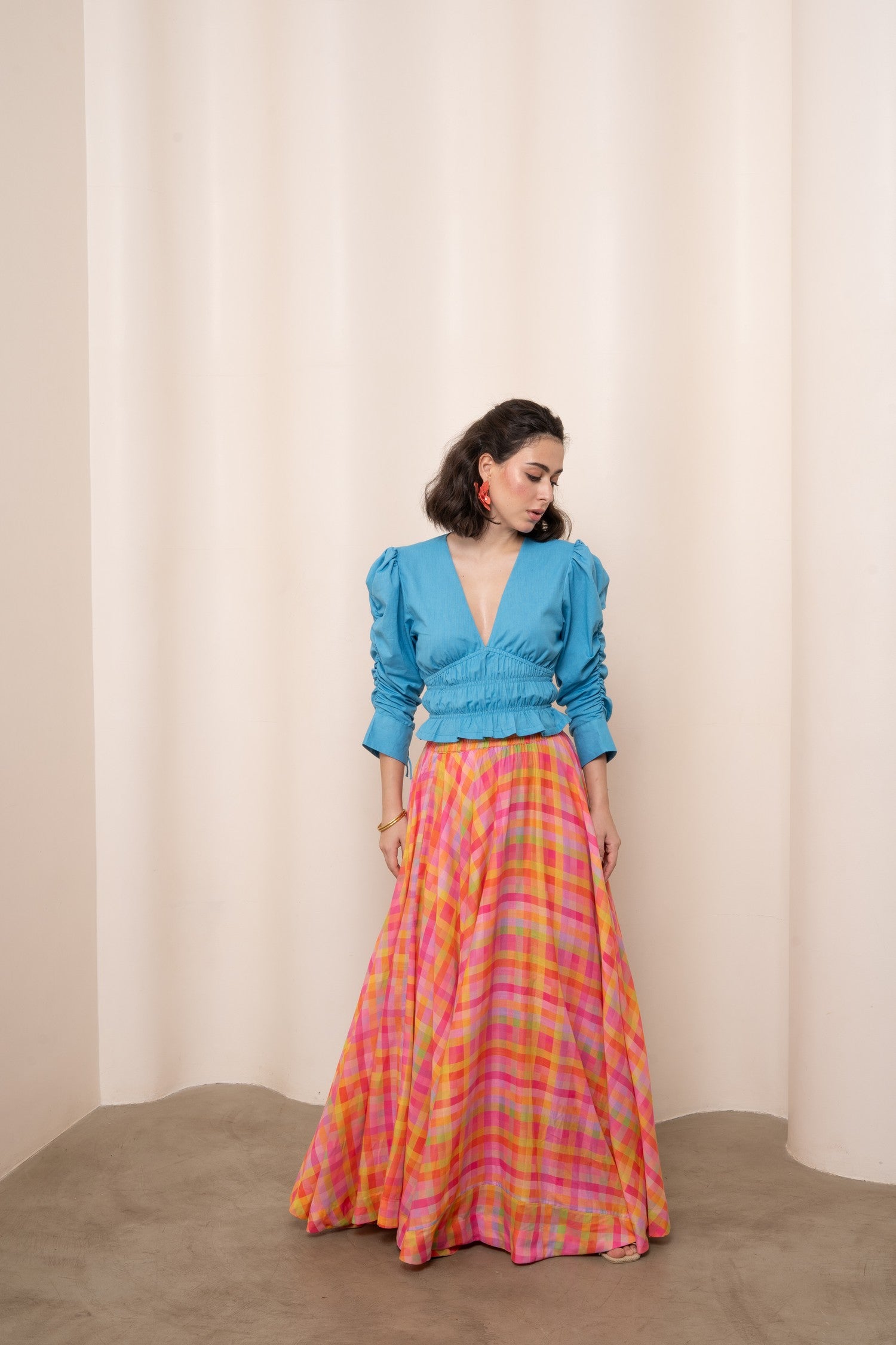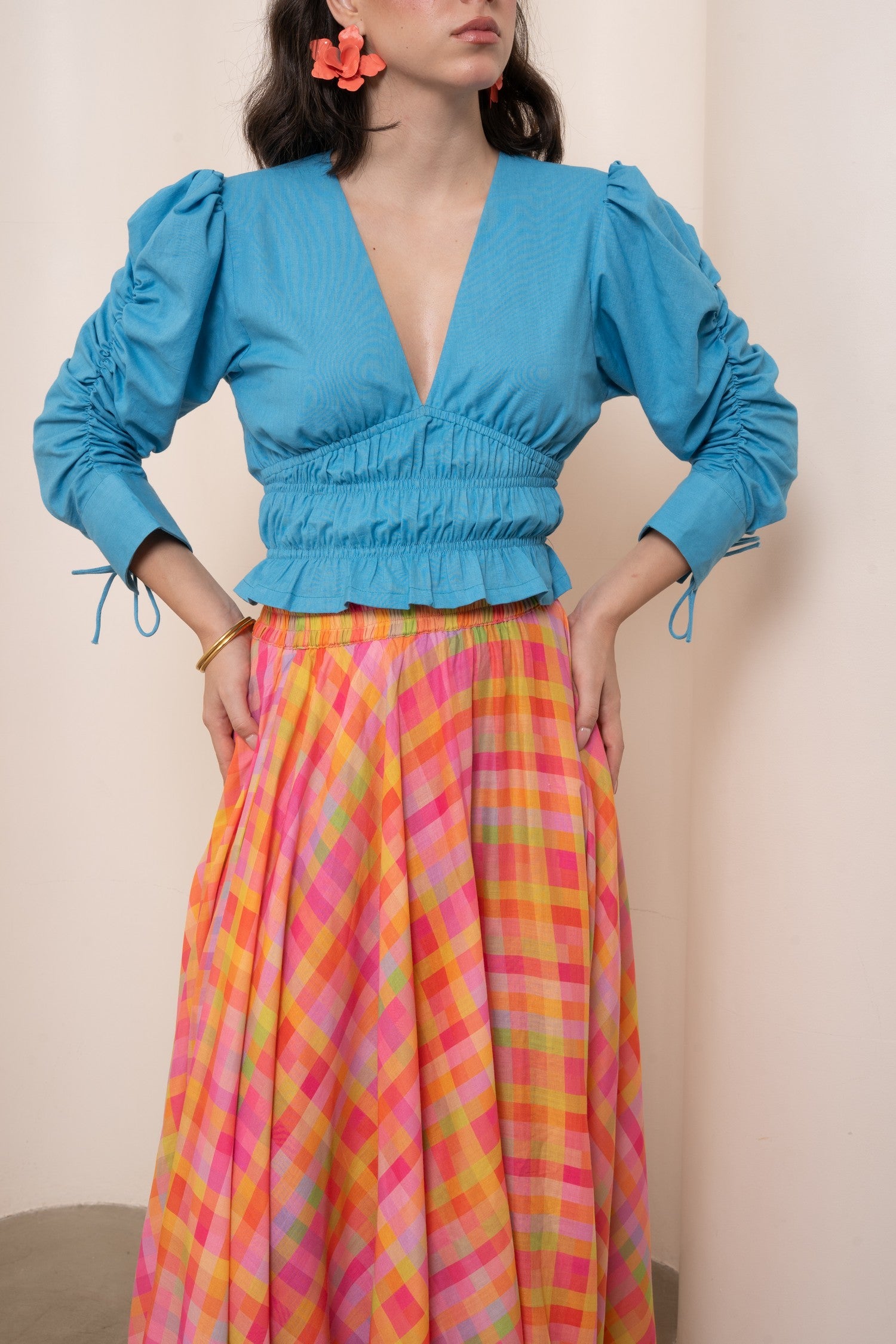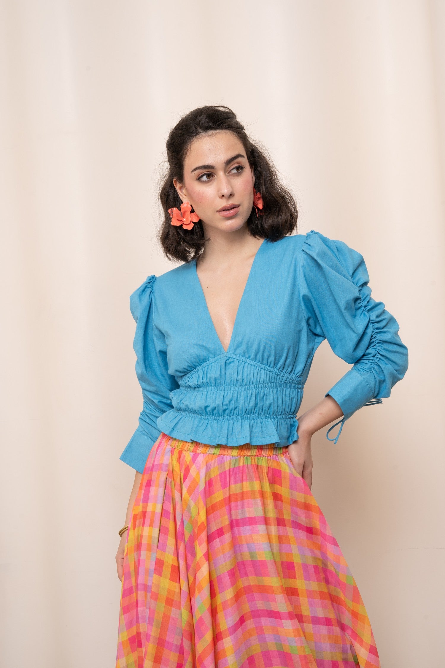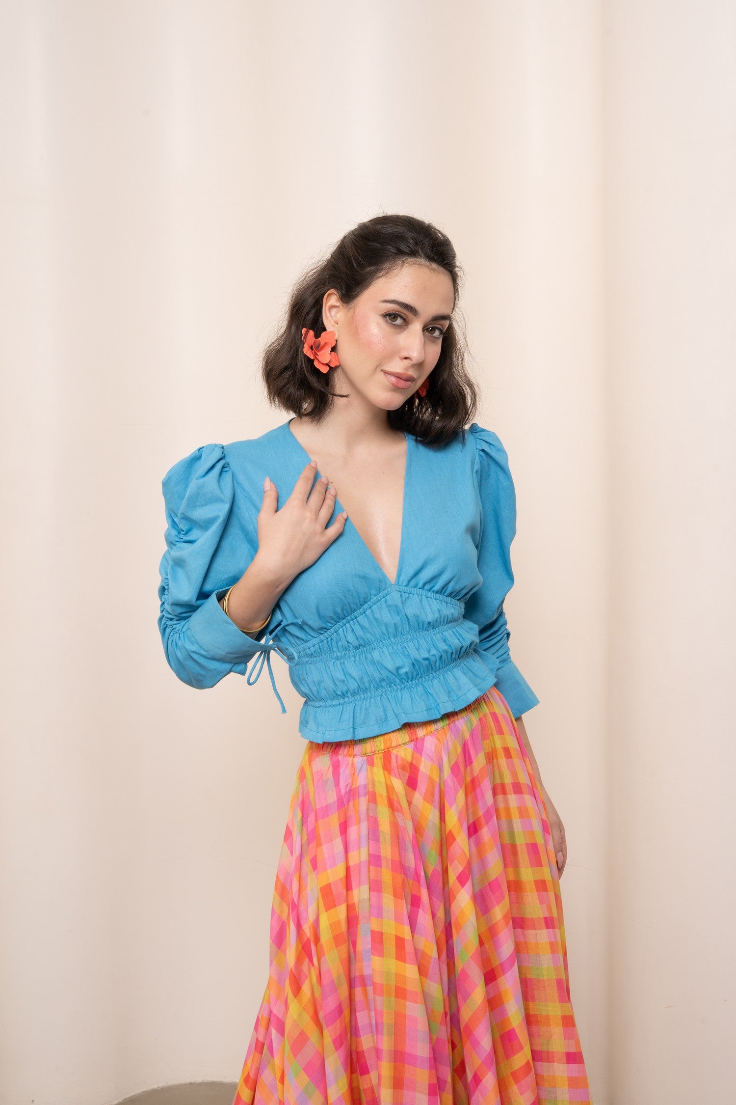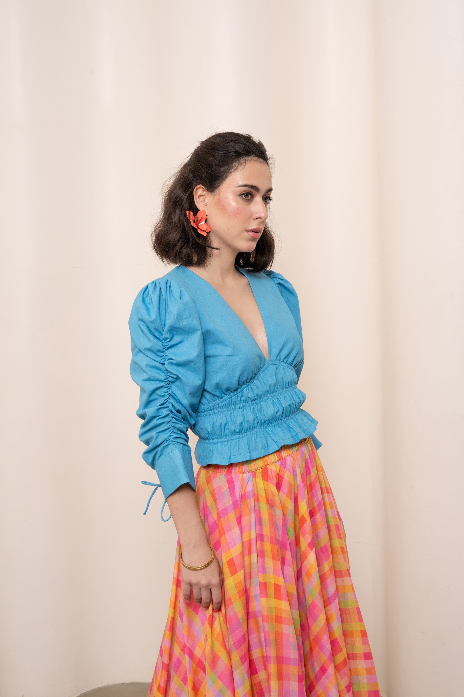 Tailored in our Mumbai workshop by Saddam and our in- house artisans, the Gianna Waist Cinch Top in Celeste Blue is made using organic cotton linen blend fabric sourced from South India. Each piece is crafted in small batches, ethically produced, and designed to last.